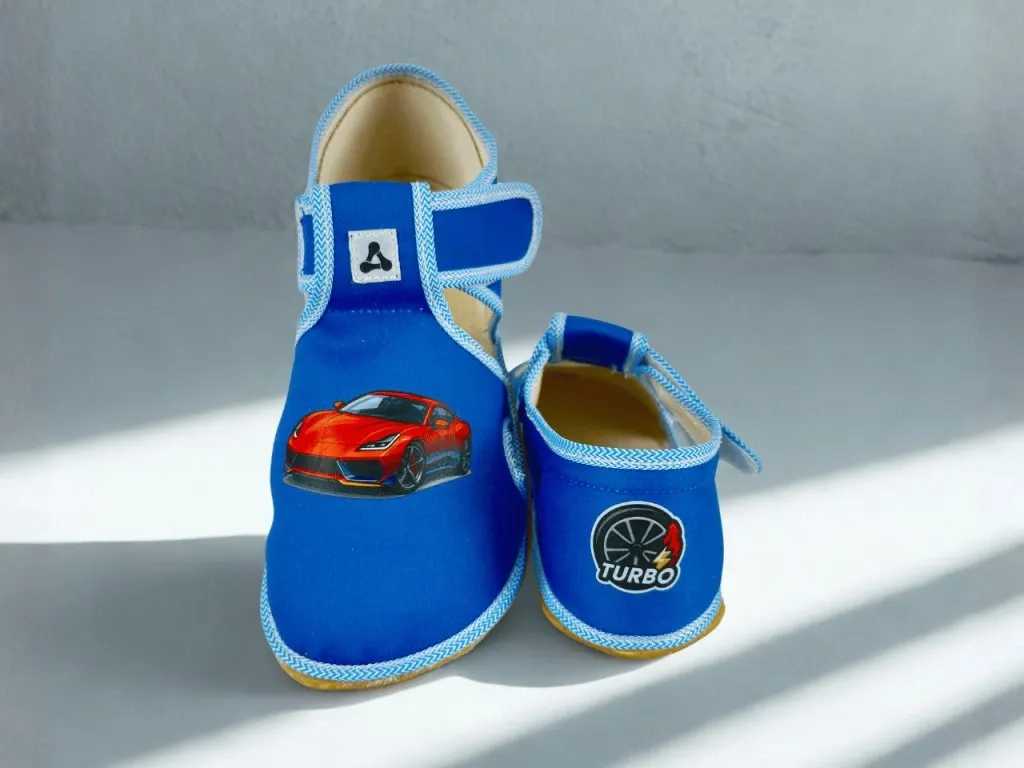 Byly vyvinuty ve spolupráci s fyzioterapeuty a lékaři, aby podporovaly přirozený vývoj dětské nohy a pomáhaly vytvářet zdravé pohybové návyky. Materiál: textil Barva: modrá s potiskem Podrážka:  4 mm tenká, gumová, flexibilní, nezanechává šmouhy na podlaze