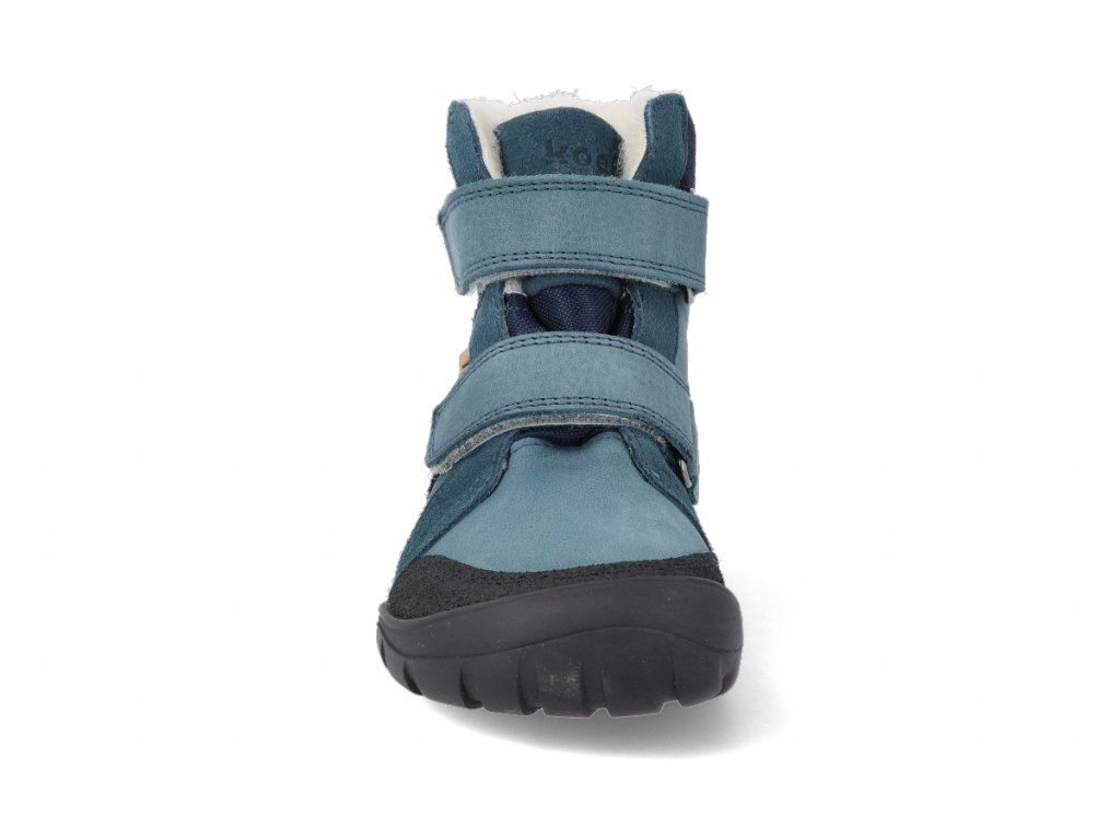Zimní boty s membránou od nizozemského výrobce KOEL4kids na nové outdoorové podešvi (vyšší vzorek).  Kompletně vyráběné v Portugalsku.  Typ: barefoot, vysoké zimní boty s membránou (provedena jako ponožka - i pod stélkou) Materiál: svršek - kombinace hladké a broušené kůže s okopem ve špičce, podšívka - merino vlna Barva: modrá/černá Podrážka: Santi - z přírodní gumy, s vyšším vzorkem Zapínání: dva suché zipy Stélka: vlněná, vyjímatelná, netvarovaná - bez podpory klenby pro správný vývoj nohy Vhodné pro: normální až širší nožky s dominantním palcem (pro prsty do vějířku), pro pomalu sestupující prsty, normální pata, normální až nižší nárt